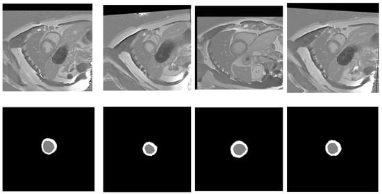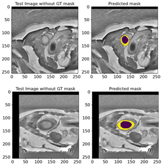 Image augmentation is widely used in computer vision to improve models’ performance and generalization, especially when there is limited training data. This technique also helps models learn under different lighting conditions, orientations, and background noise, making them more robust and reliable in real-world applications. Since the source training data contains only 33 normal cases with 235 original images, we applied data augmentation techniques [] to cardiac MRI images to augment the training data and improve the model training. It is a crucial step that allows us to increase the variety of data for training the model. To enhance the robustness and generalizability of the model while maintaining anatomical realism in cardiac MRI data, we adopted a carefully designed data augmentation strategy. A horizontal flip was applied with a probability of 0.5, introducing left–right symmetry without violating the anatomical integrity of the images. Mild rotations up to 5 degrees were allowed with a 30% chance to simulate natural variations in patient positioning during scanning. In addition, small-scale geometric transformations, including slight shifts (up to 3%) and zooms (up to 5%) combined with the same modest rotation limit, were applied with a 50% probability to introduce controlled spatial diversity. To simulate minor variations in scanner acquisition settings, subtle changes in brightness and contrast, limited to 5% in either direction, were introduced with a 30% probability. This augmentation setup prioritizes clinically plausible transformations, ensuring the anatomical consistency of cardiac structures while still promoting sufficient variation to aid in model generalization. These augmentation methods generate various images, which allows the model to learn under different conditions and enhances its generalization ability. This augmentation process results in generating 3000 images in total. Figure 3 shows different examples of augmented images with their corresponding masks.