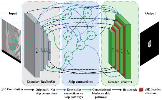In our quest to improve architectures for medical image segmentation, we present a novel model that combines the benefits of UNet++ [] with the power of the ResNeSt (split-attention networks) encoder [] and cSE decoder attention blocks []. The effectiveness of the ResNeSt encoder lies in its ability to divide attention. It uses a channel-splitting mechanism to improve feature representation and allows the model to pay attention to different aspects of the image, which is especially significant for accurate segmentation. For further enhancement of the model performance, we incorporate channel SE attention blocks into the network’s decoder. In our study, we also evaluate its performance in comparison to concurrent spatial and channel squeeze and excitation (scSE) decoder attention blocks []. These blocks integrate the squeeze and excitation (SE) [] channel attention with spatial attention. This integration enables the model to flexibly adjust to various situations and enhances the precision of segmentation. Thus, we incorporate ResNeSt and SE decoder attention blocks into the design of UNet++. It enables us to preserve the advantages of UNet++ in terms of context and local information, while enhancing them with ResNeSt and SE mechanisms. The result is an efficient and accurate model for segmenting the left ventricle and myocardium in MRIs. The architecture of the proposed model is illustrated in Figure 4. The gray blocks in Figure 4 correspond to the encoding part of the model, while the green ones correspond to the decoding part. The dashed black arrows represent standard skip connections, while the dashed blue arrows denote dense skip connections, and the solid green arrows indicate convolutional blocks on skip pathways. The Xi,j blocks represent convolutional operations, and the red blocks correspond to the cSE attention mechanism, which is further visualized in detail in Figure 5.