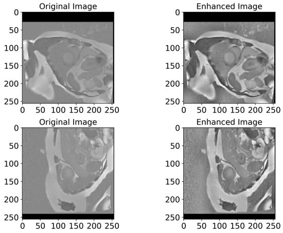 A visualized comparison of original images with enhanced images. The left column presents the original MRI images of the heart, while the right one shows the enhanced images processed utilizing CLAHE and bilateral filtering methods. Visually, the enhanced images demonstrate an increased contrast and clarity, which leads to a more accurate heart segmentation. These visible improvements give DL models the ability to more accurately highlight critical structures and borders of the heart, which in turn improves the diagnosis quality.