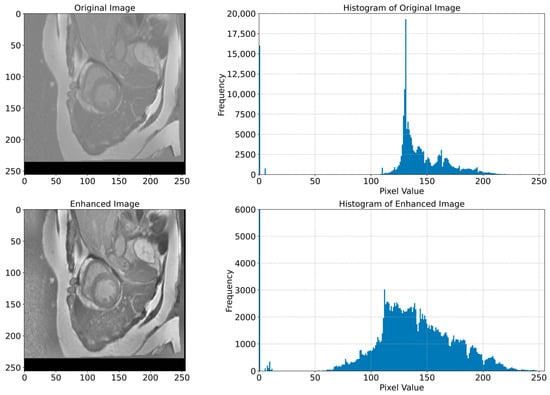 Original and enhanced images with their corresponding histograms. The top row shows the original MRI image of the cardiac region, and its histogram shows the distribution of pixel values. The bottom row shows the enhanced image and its histogram, which shows the redistribution of pixel values that resulted in an increased contrast and improved visibility of cardiac structures. This redistribution is necessary for a better recognition and segmentation of cardiac structures, which is crucial for the application of DL models in the segmentation tasks.