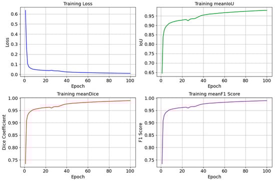 We monitor changes in metrics such as the loss, Intersection over Union (IoU), Dice coefficient, and F1-score during the model training to understand how well our model learns and how effectively it can generalize to new unseen data. In DL, loss measures the difference between the predicted labels and the actual labels, and when it decreases, it refers to an improvement in the model. We also utilized the IoU, the Dice coefficient, and the F1-score to evaluate the quality of the segmentation outcomes, where high values of these rates indicate an accurate match between the predicted and actual masks. In Figure 8, we illustrate the graphs that represent the loss, IoU, Dice, and F1-score curves. Their changes’ smoothness indicates a stable learning process. The smooth curves without sharp fluctuations in Figure 8 tell us that our model adapts well to the data and does not overfit. When analyzing these curves, the decrease in the loss curve reaches ~0.011, and the simultaneous increase in the IoU reaches ~0.98%, while the Dice coefficient and F1-score values reach ~0.99%. All these values verify the progress in the model training and its ability to perform the segmentation task more precisely.