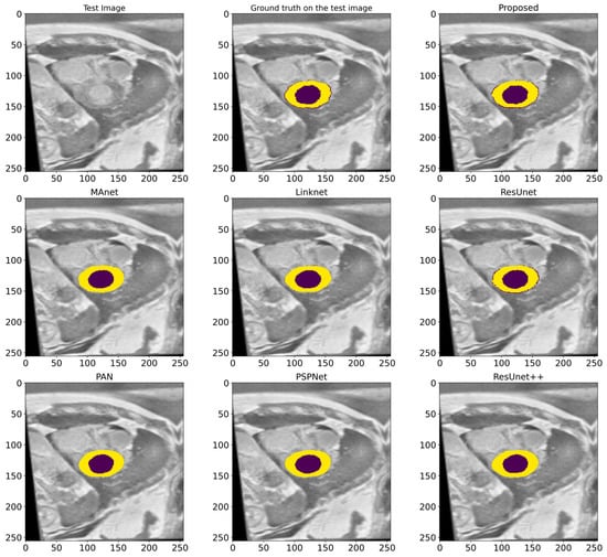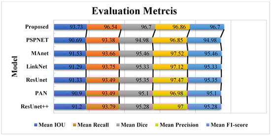 In this work, a comparative evaluation of the performance of the proposed model with six other SOTA deep segmentation models was carried out to demonstrate its superiority over its analogs. Figure 10 provides a qualitative comparison of segmentation results produced by various models against the ground truth. The proposed model demonstrates the highest visual accuracy, closely aligning with the manual annotations for both the LV and Myo regions. ResUnet also performs well, showing smooth and spatially coherent boundaries, although with slightly less precision than the proposed model. In contrast, models such as PAN, PSPNet, and ResUnet++ tend to over-segment the Myo area, while others like MAnet and LinkNet display a moderate agreement with the ground truth. These visual results support the effectiveness of the proposed architecture in capturing detailed anatomical structures more reliably than existing approaches. Table 2 provides more evaluation metrics, such as the Recall, Dice, precision, and F1-score, that allow for a thorough comparison of the performance of different models. The visualization of these metrics is presented in Figure 11, which enables us to demonstrate their comparison. The analysis of the results showed that the proposed model not only outperforms other modern models in most metrics but also demonstrates stable results on various datasets, which indicates its versatility and reliability. Table 2 shows that our model demonstrates superiority over the best SOTA segmentation model (MAnet []). Specifically, it outperforms MAnet by an IoU of 2.2%, a Recall of 2.88%, a Dice of 1.24%, and an F1-score of 1.24%. These results confirm the high efficiency and accuracy of the proposed model, making it superior not only to MAnet but also to the other six SOTA segmentation models. The very small standard deviation values indicate that our model performs well across all batches and proves the stability of the model’s performance. The results in Table 2 demonstrate the effectiveness of the proposed enhancements, reflecting clear improvements in the segmentation performance. The higher rates of Recall and precision indicate that our model can more effectively identify and classify objects in images and minimize the number of missed objects (false negatives) and misclassified objects (false positives). These findings indicate the value of our study and the development of the proposed approach; moreover, these results confirm the excellence of our model and indicate its potential for applications in various practical contexts where precise segmentation is critical. Therefore, the proposed model can provide a foundation for future research and development in image segmentation.