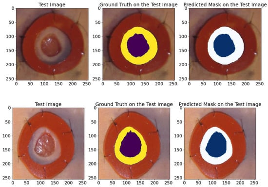 To evaluate the proposed model’s capacity for generalization, we utilize the wound closure progress database available at the following link: (https://datadryad.org/stash/dataset/doi:10.25338/B84W8Q, accessed on 10 June 2024) []. This dataset contains 256 images showing the progress of wound healing in mice over 15 days after wounding. This dataset provides a valuable resource for medical biology and medical photography researchers, allowing the study and analysis of wound healing processes at the molecular and tissue level. The images in this database do not contain labels, so we used the Labelme python package [] in the Python programming language to annotate them. After annotating the data, we created the corresponding masks correctly, and then we augmented the data using techniques from the albumentations python package [], which allowed us to generate 2000 images. Implementing this methodology enabled us to broaden and diversify our dataset, consequently augmenting its size and variety. Thus, this action enhanced the precision of evaluating the generalization capability of our model. Analyzing the findings from this database allowed us to enhance our study and verify the robustness of the suggested approach under different circumstances and source data.