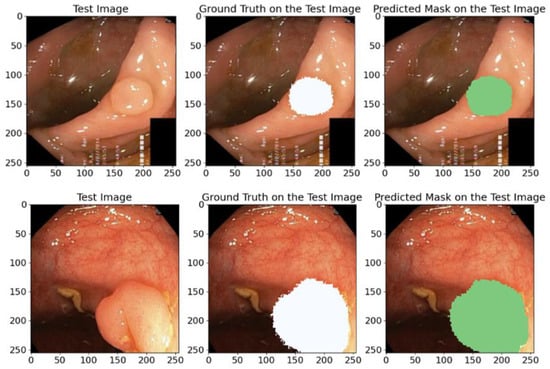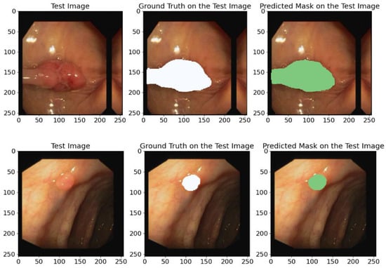 Our evaluation of the suggested model’s applicability was conducted utilizing the Kvasir-SEG database []. The Kvasir-SEG database, which is available at https://datasets.simula.no/kvasir-seg/ (accessed on 12 June 2024), is specifically prepared for polyp segmentation. It comprises 1000 polyp images together with their matching reference masks. To enhance the training process as well as the stability of the model, we implemented data augmentation techniques, enabling us to augment the number of input images to 2000.