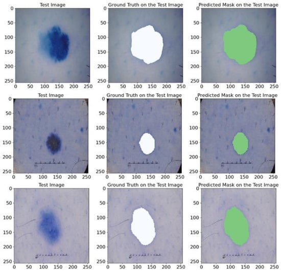 To thoroughly assess the proposed model’s generalization performance, we also validated it on the ISIC 2017 (International Skin Imaging Collaboration, https://challenge.isic-archive.com/data/#2017, accessed on 16 June 2024) dataset []. This dataset comprises 2000 images together with their matching masks, enabling an objective assessment of the precision of skin lesion segmentation. The ISIC 2017 is a widely recognized and comprehensive database in the realm of dermatological diagnostics, offering high-quality annotated images for developing and testing segmentation algorithms. Incorporating this dataset into the validation procedure of our model offers a rigorous assessment of the model’s capacity to generalize and prove its performance in real-world clinical situations.