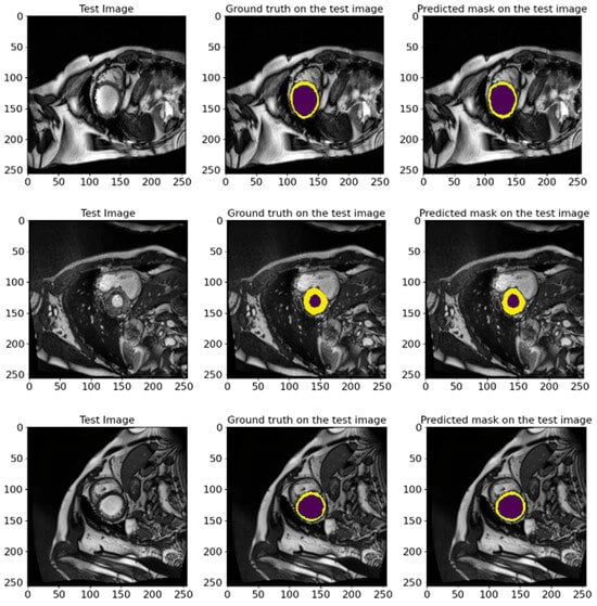 Figure 9 illustrates various examples from the test dataset with the corresponding actual masks generated by the experts and the predicted masks produced by our model. Examples demonstrate the segmentation accuracy of the model. A comparison of the actual and predicted masks shows that the proposed model successfully identifies the significant structures of the cardiac region, including the left ventricle and myocardium. The model demonstrates a high accuracy even in complex cases where the boundaries of the structures are less clear. These visual results confirm the effectiveness of the developed pre-processing methods and model architecture in improving the quality of the automatic segmentation of medical images. Our proposed heart segmentation model based on deep neural networks and image enhancement demonstrated a high efficiency and accuracy. It confirms its potential for use in clinical practice and contributes to improving methods for diagnosing cardiovascular diseases.