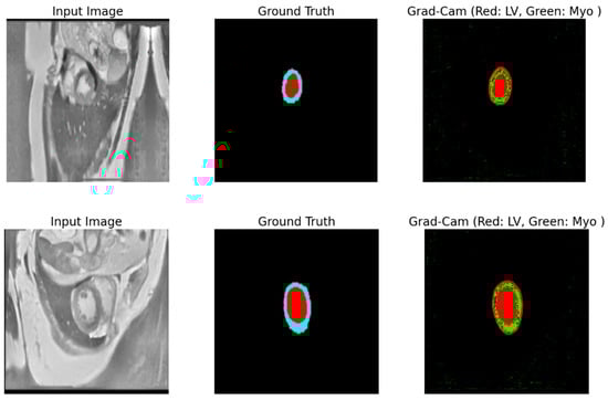The process inside the framework is simply and straightforwardly detailed as follows: the input MRI raw image goes into the trained model, which predicts the outcome, then Grad-CAM pinpoints which parts (areas) of the image most influenced the predictions, and the heatmap highlights the crucial ones in the MRI image. In Figure 19, we visualize two distinct samples in three columns. The original image (left), which is an MRI slice of the heart region, serves as input to the model. The true markup (ground truth) (center) is a reference created by experts that shows where the LV (Red) and Myo (light blue) are. Grad-CAM overlays (right) show which areas the model paid attention to when analyzing the image. In this column, red areas are associated with the LV, while green areas are associated with the Myo. Grad-CAM shows that the model correctly identifies areas corresponding to the LV and Myo. They almost completely coincide with the true markings. From analyzing Figure 19, we see two crucial facts: