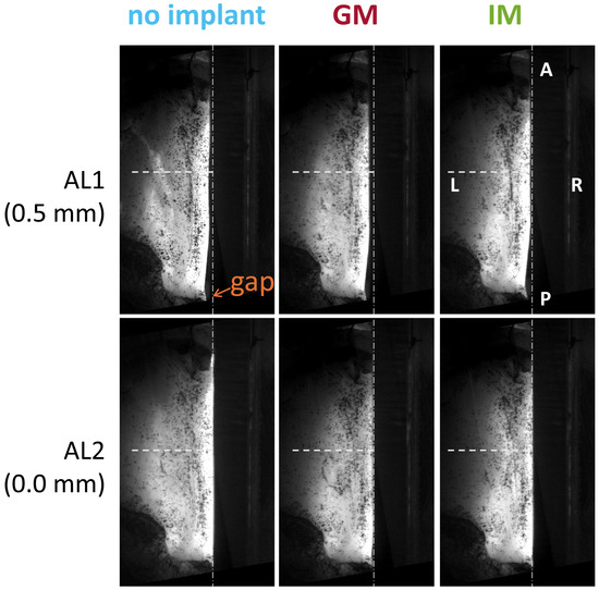 To evaluate the effect of implant location on the medial shape of the glottis, three implant conditions were evaluated: baseline without an implant (no implant), implant at the glottal level (GM), and implant placed in the infraglottic space (IM). Figure 1 shows a schematic of the larynx model setup, with the implant location specified in reference to the glottis height. To evaluate the effect of medialization depth, two levels of adduction were tested. Adduction level 1 (AL1) simulated the case of vocal insufficiency, where the arytenoid of the paralyzed fold was removed 0.5 mm laterally from the mid-sagittal plane using micrometric screws. This induced a posterior glottic gap that is visible in Figure 2. Adduction level 2 (AL2) simulated the medially adducted case, where the vocal process was medialized against the Plexiglas plate.
