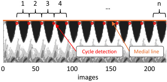 The dataset was segmented into subsets of complete cycles, discarding the incomplete cycles at the beginning and the end. Videokymography along the mid-membranous plane was used on the raw images for this purpose [23]. Each cycle was identified by analyzing the contrast of the kymogram and then processed independently (Figure 3). All cycles were averaged to produce a representative mean cycle for each experiment, which together constitute the data that will be discussed in this paper.
