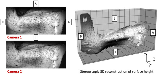 Raw 3D digital image correlation (DIC) reconstruction of the vocal fold medial surface during phonation. Anatomical directions are labeled (A = anterior, P = posterior, I = inferior, S = superior). Left: stereo camera images acquired simultaneously. Right: resulting 3D surface reconstruction. Missing regions indicate areas where speckle pattern quality or tissue deformation exceeded DIC tracking limits. No interpolation was applied to maintain data integrity.