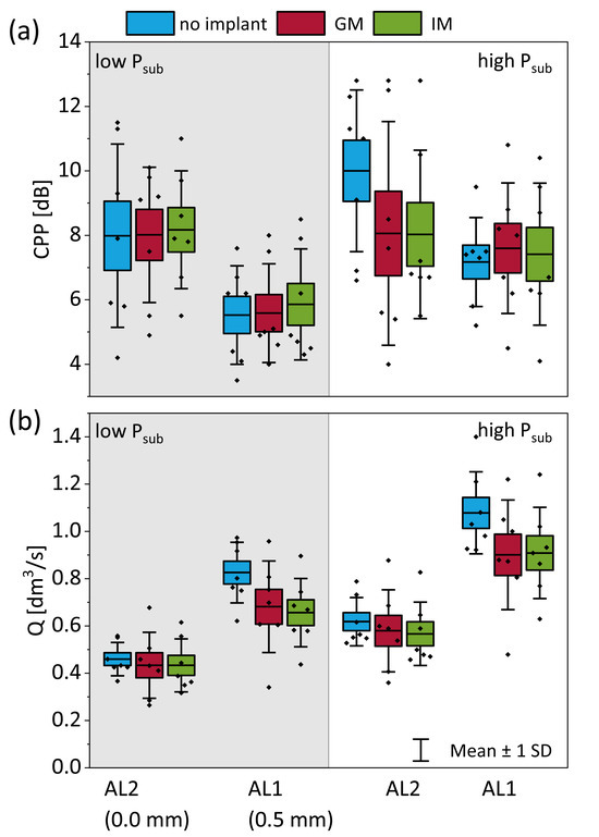 In under-adducted conditions (AL1), IM resulted in a more pronounced MDA increase (43% higher than no implant) compared to GM (16%). Conversely, in fully adducted conditions (AL2), where the glottis was already appropriately closed, the addition of an implant did not enhance vibratory parameters and, in several cases, worsened phonation quality (19.6% average reduction in CPP in high Psub cases) as seen in Figure 5. However, even in these conditions, IM generally exhibited a slightly higher MDA compared to GM. Indeed, the average MDA was 24% lower for GM compared to no implant, when IM increased the MDA by 8%.