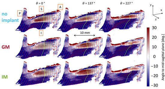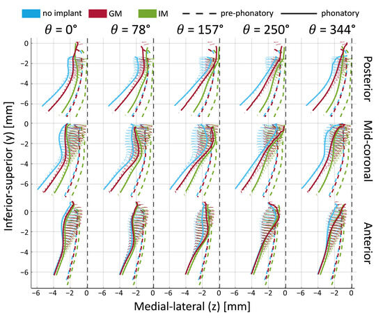 The main observations from tracking the medial surface′s trajectories are that the infraglottal shape is narrower and that the divergent angle is larger with IM. The mid-coronal plane demonstrates the highest vibratory amplitude, while the no-implant condition shows limited glottal closure with a persistent posterior gap. Consistent with observations from Figure 6, medialization reduces the glottal gap toward the end of the cycle (e.g., at θ = 157° and θ = 344°). GM and IM display a flat contact area near the midline, absent in the no-implant condition. At θ = 250°, the superior edge separates from the medial plate in the no-implant condition, whereas contact persists in the implant cases. This is indicative of a shorter closed phase in the no-implant case.