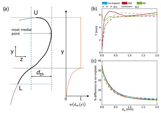 The weight is defined at each vertical location according to the horizontal distance from the most medial point and the threshold distance , which represents the distance from the most medial point beyond which the weight function starts to decay (Figure 8a). ∝ is a factor determining how fast the weight function decreases. For more details on the methodology, refer to Lehoux et al. [18].