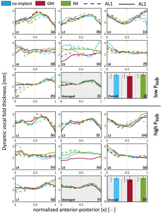 Figure 9 illustrates the dynamic vertical thickness calculated using Equation (5). These values do not correspond to a specific phase angle but instead reflect a time-integrated measure of dynamic thickness, capturing the range of medial–lateral displacement amplitude across the full glottal cycle. Results highlight that the adduction level (AL1 vs. AL2) and implant location impact the vertical thickness. The figure is divided into two halves: the top half gathers low Psub cases, and the lower half gathers the high Psub cases. For each condition, subfigures (a)–(h) and (k)–(q) show the vertical thickness as a function of the normalized anterior–posterior location. Subfigures (i) and (r) show the mean thickness averaged across all larynges, while subfigures (j) and (s) show the mean thickness averaged along the anterior–posterior axis. The range for the mean vertical thickness (2 to 2.7 mm) aligns with the range for the mean values calculated for the pre-phonatory (static) observations (Figure 8, Section 3.3) for low (below 0.25). Posteriorly, under-adducted cases feature less vibration, which translates to lower vertical thickness, which is particularly observable in L5 and L7 at a low Psub. Overall, under-adducted cases (AL1) feature a lower vertical thickness than the adducted cases (AL2) in no-implant and IM conditions. GM shows a slight decrease in dynamic vocal fold thickness for AL2 and is overall below no implant and IM.