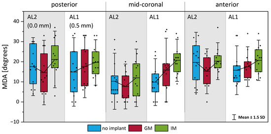 Figure 10 illustrates the maximum divergence angle at the anterior, mid-coronal, and posterior locations under the three implant conditions. Consistent with the hypothesis derived from the VSG measurements, the implant location significantly influenced the MDA during phonation.