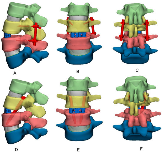 A Unilateral L3–L4 facetectomy was performed. After excision of the posterior longitudinal ligament and annulus fibrosus, the nucleus pulposus was removed. An appropriately sized TLIF cage was designed with CAD software (SolidWorks 2023, Dassault Systèmes Inc., Vélizy-Villacoubla, France) based on the L3–L4 gap and was placed. In the BPSS model, four pedicle screws and two rods were also crafted with the same CAD software and employed to fix L3 and L4. Figure 2A–C depict the BPSS model from sagittal, anterior, and posterior perspectives, respectively. In the RTSS model, a similar TLIF cage was inserted between L3 and L4. Two transdiscal screws passed through the L3 pedicle inferiorly and terminated at the inferior border of the L4 vertebral body. The RTSS model is displayed in sagittal, anterior, and posterior views in Figure 2D–F, respectively. In both the BPSS and RTSS models, the diameter of the screw size was chosen to be 5.5 mm. The length of the transdiscal screw was 68 mm, while the pedicle screw length was 40 mm.