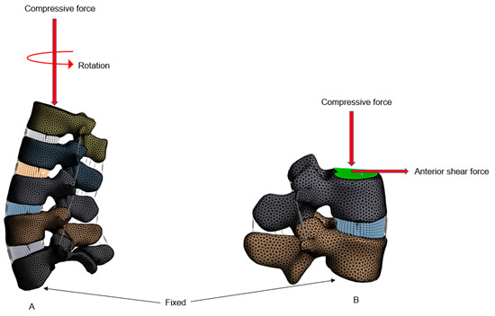 Lastly, anterior and posterior shear loads of 150 N were applied parallel to the upper endplate of the L3 by fixing the bottom surface of L4. A representative boundary condition for the intact model is illustrated in Figure 3A for axial rotation and Figure 3B for anterior shear loading. Because of the body-dependent mesh sizing, which would lead to highly distorted elements for shared nodes between bodies, bonded contacts were utilized to connect the vertebral discs to the endplates. Bonded contacts were also utilized for connection of the endplates to the vertebral bodies. All implants were similarly connected to the existing vertebral bodies using bonded connections, with Boolean operations where appropriate to achieve a cohesive model.