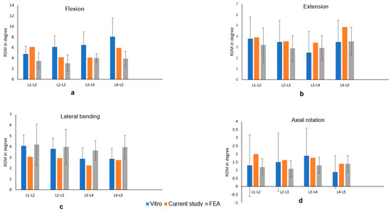 Comparison of ROM with the in vitro and FEA study for flexion (a), extension (b), lateral bending (c), axial rotation (d).