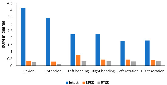 In Figure 5, the ROM for flexion, extension, left bending, right bending, left rotation, and right rotation is compared between the BPSS and RTSS models for the index level. The ROM of the BPSS and the RTSS was compared with the intact lumbar model. Both treatment models showed significant reduction in ROM across all loading scenarios when compared to the intact model. Additionally, the RTSS model demonstrated a further reduction in ROM compared to the BPSS model under all loading conditions. The greatest difference between the two models was observed in extension, where the RTSS model reduced ROM by 58% compared to the BPSS model. The smallest difference was seen in right rotation, with a 13% reduction.