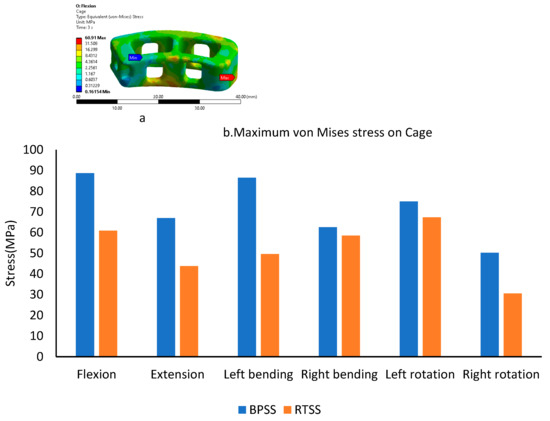 A typical von Mises stress contour on RTSS cage under flexion condition (a). Comparing maximum von Mises stress on the cage between the BPSS and the RTSS (b).
