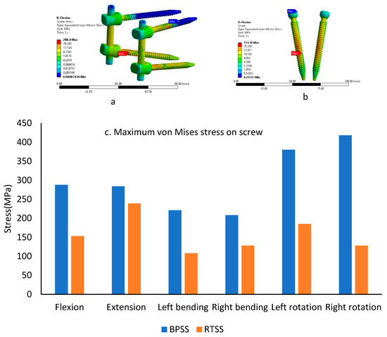 A typical von Mises stress for the BPSS and RTSS models is shown in Figure 7a and Figure 7b, respectively, for the flexion condition. Figure 7c illustrates the screw stress for the BPSS and the RTSS models under various physiological loading conditions. In the BPSS model, higher stress was observed during axial rotation compared to flexion–extension and lateral bending scenarios. The maximum screw stress in the BPSS model was recorded at 418 MPa during right rotation, while the minimum stress was 208 MPa during right bending. In contrast, the RTSS model exhibited the highest screw stress (239 MPa) during extension and the lowest stress (108 MPa) during left bending. In lateral bending, the RTSS model showed a 40% lower screw stress compared to the BPSS model. For extension, the difference in screw stress between the RTSS and BPSS models was minimal, with both recording a value of 239 MPa, a smaller variation compared to other loading conditions.