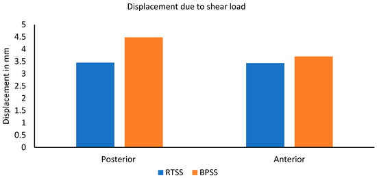 Regarding anterior and posterior shear loads, a shear load of magnitude 150 N was applied at the center of the L3 vertebra in a horizontal direction parallel to the base of L4. These loads replicated the loading scenarios in the mechanical assessment of cadaveric motion segments [33]. The displacement comparison due to shear load is depicted in Figure 8. The RTSS model illustrated anterior and posterior displacement of 3.43 mm and 3.44 mm, respectively, whereas the BPSS model showed 3.70 mm and 4.48 mm. No notable difference was experienced in these two models due to the anterior shear load, but the posterior shear load RTSS model exhibited 23% lower displacement than the BPSS model. Overall, the RTSS model showed better shear load resistance than the BPSS model for the same loading condition.
