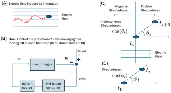 (A) Cell migration is induced by the application of an electric field in a process known as galvanotaxis. (B) Feedback control is implemented to automate the regulation of the applied electric field to achieve a desired collective behavior. A neural network controller adjusts the EF strength by way of a current source based on the measured error between the observed response and target behavior of a population of cells. (C) Cell behavior is quantified by computing the instantaneous directedness of each cell at each time step. This, in turn, is used to compute the Recruitment Index (RI), which reflects the proportion of cells moving right vs. left. (D) A commonly used definition of directedness considers cell displacement with respect to its original position, which can be used when there is no polarity switch.