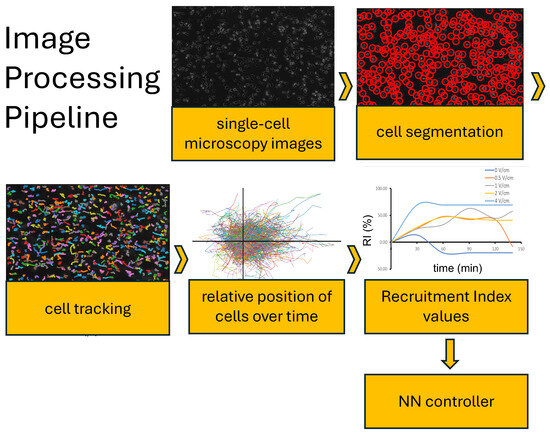 To analyze single-cell microscopy data, we develop an image analysis tool (refer to Figure 2) that consists of a script written in Python 3 designed to track the cell position over time and compute metrics of interest. The inputs for the image analysis tool consist of images taken using a microscope every 5 min. Then Trackpy [21], which is a particle tracking library in Python that operates for two and higher dimensions, is used for detecting and monitoring the cells within these images over time. Next, the trajectories of the cells are extracted and examined in order to calculate the metrics described in the next section. The calculated metrics are then stored in a comma-separated values (CSV) file format. The CSV file is then accessed by the NN-based algorithm for real-time feedback control.