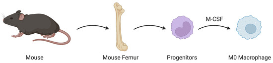 Schematic depicting how macrophages were prepared. Bone marrow cells are extracted from the tibia or femur of mice. These cells are then differentiated into naive macrophages.