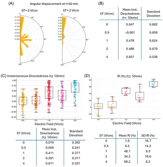 (A) A snapshot of the angular displacement of cells at time t = 50 min for two different electric field strengths. (B) A table with the computed mean instantaneous directedness and corresponding standard deviation across cells for each EF strength at t = 50 min. (C) The distribution of the instantaneous directedness of all cells for all times greater than or equal to 50 min after steady state dynamics are achieved. (D) The distribution of the recruitment index for all times greater than or equal to 50 min after steady state dynamics are achieved.