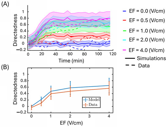 The number of cells utilized to fit the mathematical model across various electric field (EF) strengths is as follows: 101 cells at 0 V/cm, 87 cells at 0.5 V/cm, 167 cells at 1 V/cm, 90 cells at 2 V/cm, and 68 cells at 4 V/cm. We only considered cells tracked for all 24 frames. In Figure 6, plot (A) shows the mean directedness computed across all cells as a function of time (simulations and data). Plot (B) shows the mean directedness value and the corresponding standard deviation for each electric field (EF) strength.