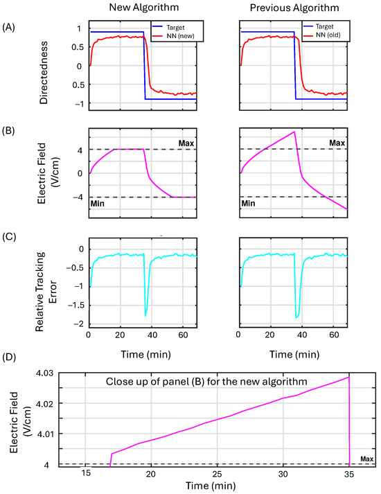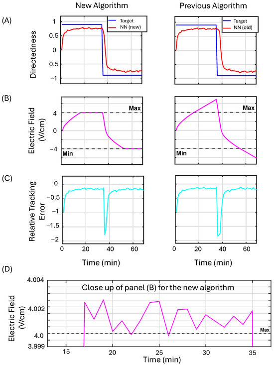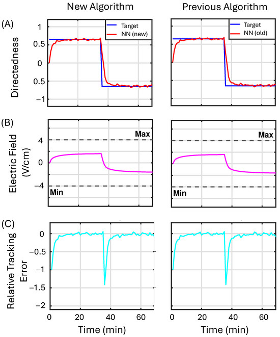 This example demonstrates that for target values that do not require the control input to reach maximum EF values, both controllers behave identically. Figure 7 presents the simulation results comparing the proposed NN algorithm that includes projection on the weight updates (first column) with the standard weight update law (second column). Row (A) displays the model’s output in red alongside the desired reference value in blue. Row (B) provides a comparison between the saturated control output and the actual output generated by the controller, with the control output being saturated whenever it exceeds the dashed black lines; the actual control output is shown in magenta. Row (C) illustrates the relative tracking error in cyan. Figure 7 demonstrates that both algorithms produce similar outputs within the specified bounds and effectively maintain the target directedness (from which we can calculate the RI value) for the population of cells.