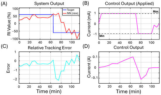 Figure 9 presents the simulation results that compare the proposed NN controller, which incorporates projections on the weight updates (first column), with the original algorithm (second column). In row (A), the model’s output is displayed in red alongside the desired reference value shown in blue. Row (B) compares the saturated control output with the actual output generated by the controller; the control output is considered saturated whenever it exceeds the dashed black lines, while the actual control output is represented in magenta. Row (C) illustrates the relative tracking error in cyan. The plot in panel (D) provides a closer view of the proposed algorithm with projections, demonstrating its ability to slow down the growth of the control output after exceeding the bounds. This results in a decreased delay when the sign of the target directedness changes.
