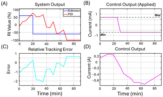 Figure A4 presents the simulation results of SMC (top row) and PID (second row). Column (A) displays the model’s output in red alongside the desired reference value in blue. Column (B) provides a comparison between the saturated control output and the actual output generated by the controller, with the control output being saturated whenever it exceeds the dashed black lines; the actual control output is shown in magenta. Column (C) illustrates the relative tracking error in cyan. Figure A4 demonstrates that both controllers effectively maintain the directedness of the cells for successful trajectory tracking.