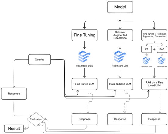 Three methodological approaches—fine-tuning, retrieval-augmented generation (RAG), and their hybrid combination—were implemented to enhance the models’ medical QA capabilities. Training the models on healthcare-specific datasets helps to create specialized versions fit for medical searches by means of fine-tuning. RAG improved response quality instead by including external knowledge retrieval systems. Combining the advantages of fine-tuning with RAG was the hybrid approach meant to maximize performance.