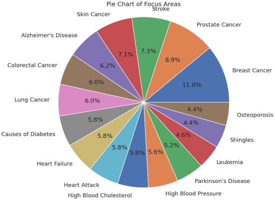 The MedQuAD dataset is spread across 5126 distinct medical focus areas, including a wide variety of conditions like Glaucoma, Diabetes, Shingles, Leukemia, and several others. The focus areas cut across different domains of medicine like neurology, cardiology, endocrinology, oncology, and infectious diseases, and cover clinically important topics in detail. In order to study the distribution of medical topic areas, we show a pie chart of the ratio of topics with more than 20 questions. Figure 2 displays the pie chart of different proportions of topics. MedQuAD’s formalized format and expert-checked answers make it especially well-suited for medical question-answering, enabling the creation and benchmarking of LLMs and retrieval-augmented generation systems. Using this dataset, we guarantee that our model is tested on clinically applicable queries, enabling an objective comparison of its accuracy, contextuality, and reasoning ability within the healthcare domain.