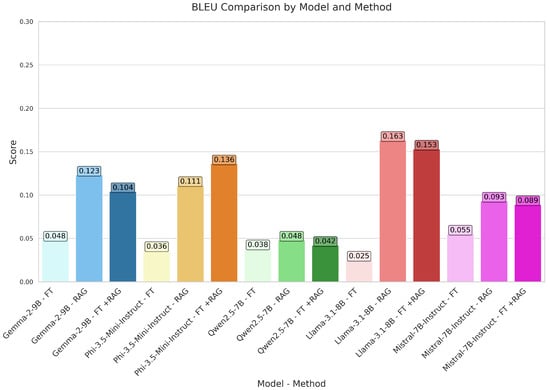 One study [] investigated FT, RAG, and FT+RAG methodologies on the Stanford QA dataset. They found a BLEU of 0.06 and METEOR of 0.44 for FT, BLEU of 0.06 and METEOR of 0.27 for RAG, and BLEU of 0.04 and METEOR of 0.16 for FT+RAG. Our best FT results were, in contrast, 0.05 BLEU and 0.20 METEOR on MISTRAL, 0.16 BLEU and 0.27 METEOR on RAG on LLAMA, and 0.15 BLEU and 0.26 METEOR on FT+RAG on LLAMA. Our models outperformed the RAG and FT+RAG approaches, but our fine-tuning results were slightly lower.
