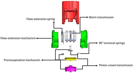 The innovativeness of the prosthesis lies in two aspects, namely, mechanical design (Figure 2) and control method. The flexion–extension mechanism uses a hinge-type apparatus with a worm gear and torsion spring, while the pronation–supination mechanism employs a pinion–crown gear and two torsional springs to enhance load capacity, store energy, and reduce motor torque. The control strategy employs a combination of sliding mode control with time base generation (SMC + TBG), ensuring precise, robust, and biomimetic movements. This combination optimizes performance, making the prototype ideal for applications requiring natural and adaptive motion []. The mechanical design of the prototype involved calculating components for the transmission system. For the worm and crown mechanism, the module, the number of starts, and crown gear teeth were determined to ensure proper sizing and mechanical performance. The pronation–supination movement utilizes a planetary transmission designed with data on gear teeth, module, pitch diameter, and transmission ratio (1.7, rounded to 2), which functions as a speed multiplier. This configuration adheres to the typical range of motion of the human upper limb, ensuring precise angular movements [].