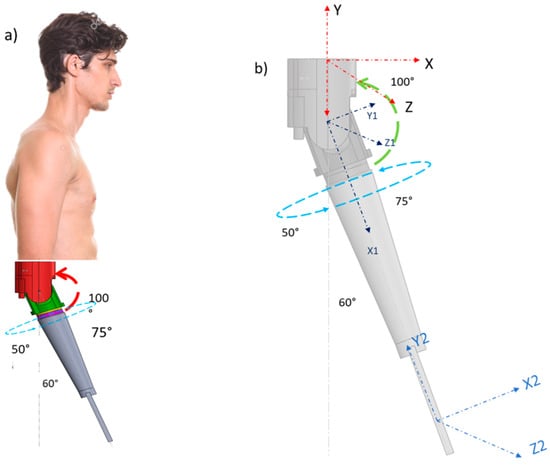 This study enables two degrees of freedom: flexion–extension (0–100°) and pronation–supination (0–50° supination, 0–75° pronation). Prototype design involved analyzing existing models’ actuator performance and integrating flexible actuators, such as springs, to enhance the replication of natural motion []. This approach ensures functionality within specified ranges and improves adaptability for rehabilitation applications.