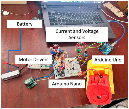 To ensure the autonomy and practicality of the prosthesis, a rechargeable battery-based power supply was used, as shown in Figure 6. A Tattu 3-cell battery was selected, delivering 11.1 V per cell, with a total output of 5 Wh and a capacity of 450 mAh. This setup balances high energy density and low weight, thereby allowing precise and responsive movements while maintaining user comfort. The battery supports prolonged usage, reducing the frequency of recharging and enhancing the user experience. Its integration was carefully planned for efficient control and power management, ensuring seamless functionality and reliability in real-world scenarios. This solution significantly contributes to the prototype’s autonomy and usability.