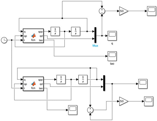 The experiments were conducted using Simulink R2024b® software and served to illustrate the behavior of the prototype, taking into account the torque generated by the motors, the effects of air resistance, the influence of gravity, and the weight of the load to be supported, and allow replication of any movement (Figure 7). In addition to the previously mentioned tests, an experiment was conducted on the prototype, considering the operating cycles over a specific period. The movements must be completed within a two-second time frame, with the actuators receiving sinusoidal signals reflecting the pulses for each motion. The block diagram represents a mass-torsional spring system in an open-loop configuration, allowing replication of any movement, as shown in Figure 7. The transfer function, derived from the mathematical model in the hardware design, supports this system. This section provides a concise description of the experimental results, their interpretation, and the conclusions drawn from them.