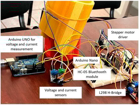 The SMC component provides robustness against uncertainties and disturbances, while TBG generates smooth velocity profiles, enabling controlled and fluid transitions in movements. This combination optimizes rehabilitation, reduces muscle fatigue, and enhances adaptability in applications requiring precise motion control. A key challenge in implementing the SMC-TBG control strategy in elbow prostheses is accurately modeling bone rotation and its impact on forearm mobility, particularly during pronation–supination movements between the radius and ulna. This aspect, which has not been addressed in previous studies such as those of [,], is essential for replicating coordinated and natural movements. The combination of TBG with SMC would not only synchronize the hand’s trajectory but also precisely model the dynamics of pronation–supination, enhancing the prosthesis’s functionality. This approach represents a significant improvement over traditional control methods, offering a more comprehensive and adaptive solution for rehabilitation applications. The objective of this experiment is to evaluate the accuracy of angular position control for a DC-geared motor using a PID controller and the SMC + TBG control method. An Arduino board controls a 12 V brushed Namiki DC motor, while the LN298N dual H-bridge driver generates the signal and manages direction control. For the pronation–supination movement, a stepper motor with its respective driver is utilized, enabling motion within the functional range designed for the prototype. The implementation includes PID tuning algorithms to generate precise signal outputs for both motions. This setup ensures accurate control of the DC motor and stepper positions, which is crucial for precision control systems. The function of a motor position controller is to interpret a signal representing the desired angle and to direct the motor to that position. Figure 5 illustrates the controlled conditions.