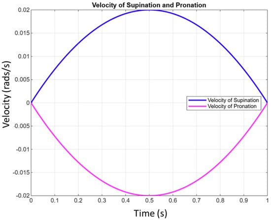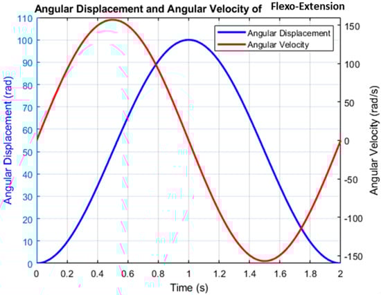 The angular displacement (blue curve) represents the θ1 angle of flexion–extension (Figure 9), following the desired trajectory imposed by the SMC + TBG controller. The Denavit–Hartenberg (DH) model confirms that movement is generated at the corresponding joint, not at the wrist. Additionally, the end-effector is not located at the hand but directly beneath the flexion–extension mechanism, which alters the kinematic chain. The angular velocity (red curve), which is the derivative of θ1, follows a bell-shaped profile characteristic of TBG control (Figure 9), ensuring smooth transitions. From the DH perspective, this configuration enables a controlled motion without abrupt accelerations, reducing mechanical stress on the structure. The homogeneous transformation matrix derived from the DH parameters confirms that the end-effector follows the intended trajectory, maintaining both position and orientation as expected. Implementing SMC + TBG within this modified DH framework enhances system stability and prevents unnecessary strain on the components. In conclusion, the simulation with SMC + TBG demonstrates efficient control of the two-DOF prostheses, validated by Denavit–Hartenberg modeling, ensuring a natural and biomechanically coherent movement adapted to its unique configuration.