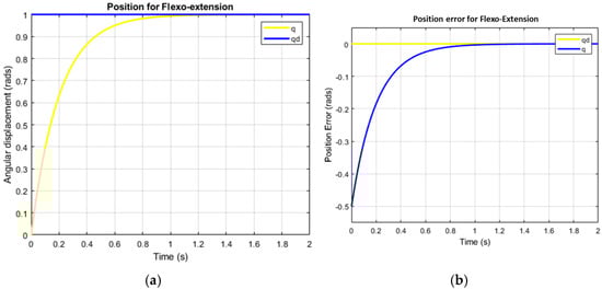 Figure 10 illustrates the system’s ability to replicate complex human movements with smooth, continuous control that reflects both actuator behavior and human body limitations. The flexion–extension graph shows bell-shaped, coordinated motion (Figure 9), while the pronation–supination graph, highlighting faster pronation than supination, highlights adaptive control. This modulation enhances the realistic replication of human motion. The flexion–extension movement exhibits high synchronization, closely mimicking natural elbow motion, while the pronation–supination movement demonstrates optimized supination, highlighting adaptive control via the SMC + TBG control strategy. This strategy ensures precise trajectory tracking and smooth velocity profiles, effectively emulating human motion with two degrees of freedom. Based on operating cycle measurements, achieving 8 h of autonomy requires a battery capacity of 11,250 mAh. To evaluate control success, error analysis compares desired and obtained positions. Figure 11b and Figure 12b show the error curve smoothly converging to zero, indicating progressive correction and achievement of the desired position. The system stabilizes in approximately 1.2 s for both flexion–extension and pronation–supination, effectively reaching zero error.