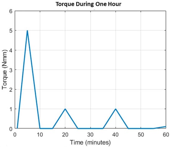 A representative time plot was constructed, in which the displacement and velocity were expressed for the movement repetitions. The graphs in Figure 11 and Figure 12 show the flexo-extension and pronation–supination profiles, which demonstrate that both movements have the same displacement during the performance of the prosthesis. Figure 14 shows torque spikes corresponding to movement cycles of the 2-DOF elbow prosthesis, with the highest peak occurring within the first 5 min. This behavior reflects efficient control using SMC + TBG for smooth trajectory tracking. However, the 450 mAh battery is insufficient, as peak performance is reached within 20 min, and the system requires an 11,250 mAh battery. To meet this demand, four 3000 mAh batteries are recommended, ensuring continuous operation and improved autonomy.