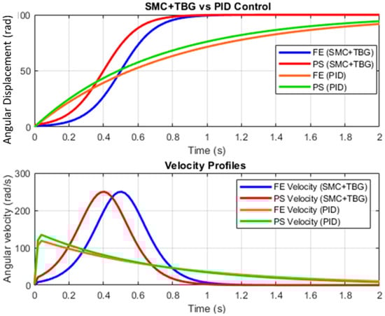 In Figure 9, smooth angular motion with symmetrical acceleration and deceleration is shown, which aligns with SMC + TBG’s biomimetic control strategy. Angular velocity peaks during rapid displacement changes and zeroes at displacement peaks, mimicking the natural movements of human joints. SMC + TBG generates bell-shaped velocity profiles, which ensure stable and precise motion under nonlinear dynamics. This approach enhances natural movement and user comfort in elbow prostheses.