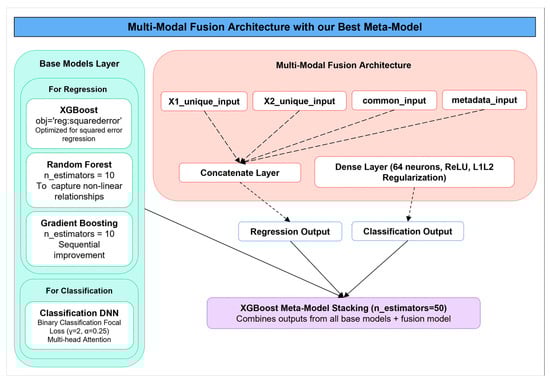 Figure 2 illustrates this integrated architecture, showcasing the interaction between input streams, the core fusion mechanism, the base learners, and the meta-model stacking layer. The stacking mechanism is led by an XGBoost meta-learner (n_estimators = 50), which synthesizes predictions from all individual models to generate refined and highly accurate outputs for both classification and regression tasks.