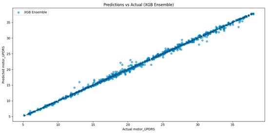 To visually validate the regression performance of the best-performing model, additional evaluation was conducted using prediction scatter plots and cross-validation diagnostics. Figure 3 shows the relationship between true and predicted motor UPDRS scores for the SE-XGB model. The distribution closely aligns with the identity line (y = x), indicating high prediction fidelity and minimal systematic deviation. This further supports the superior R2 score of 99.78% and low RMSE observed in our quantitative metrics.