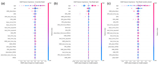 Key features such as DFA, HNR_Jitter (Abs), age, and test_time_log demonstrated consistent influence across models, providing valuable insights into model decision-making and clinical relevance.