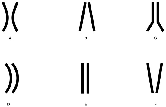 Classification of the nasopalatine canal in the sagittal plane. (A) Hourglass-shaped, (B) Conical, (C) Funnel-shaped, (D) Banana-shaped, (E) Cylindrical, (F) Inverted cone-shaped.